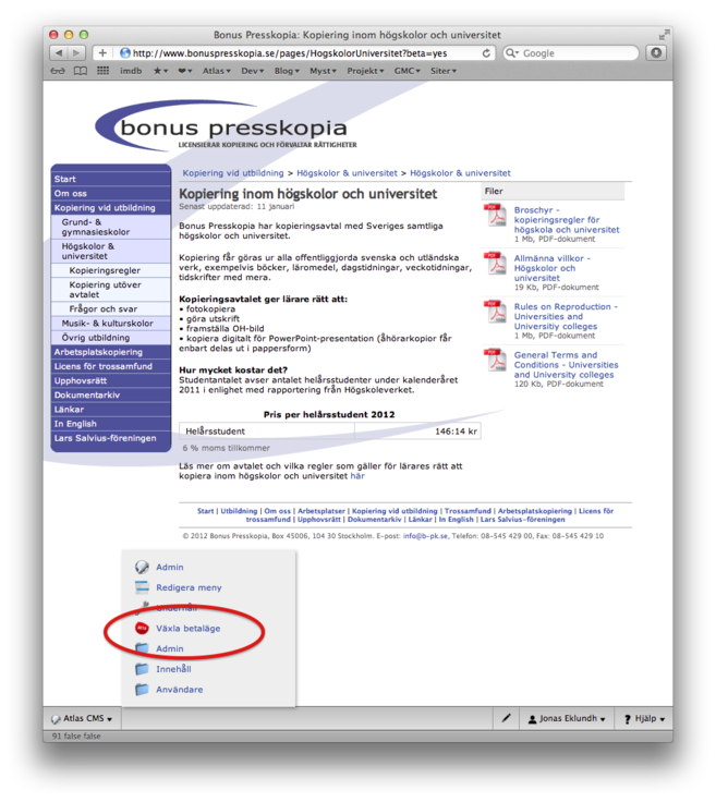 Det gör ni via admin-menyn nere till vänster, där finns ett val (om er sida inte är satt permanent som beta, i vilket fall ni återigen inte behöver göra något) för att växla betaläget på eller av.