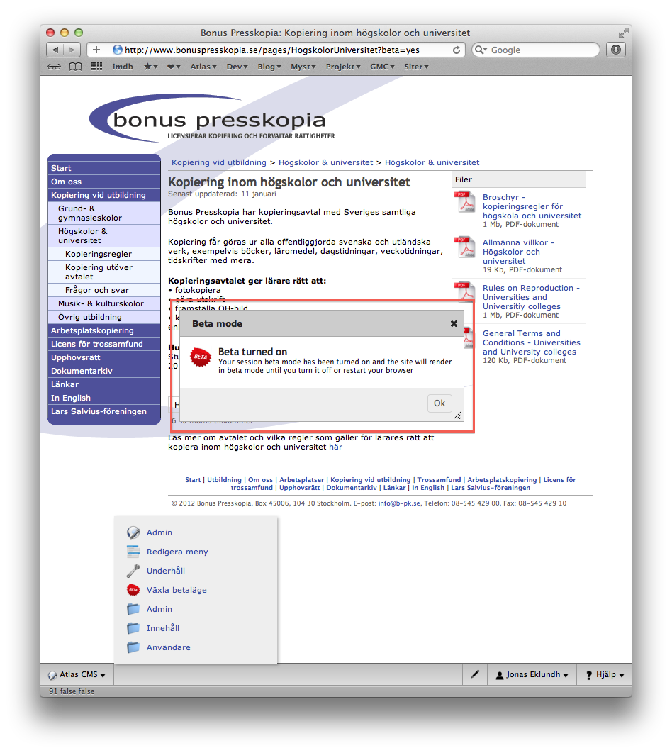 Och när ni trycker på OK så är adminmenyn i botten färgad för att visa att ni är i beta-läge på er sida.