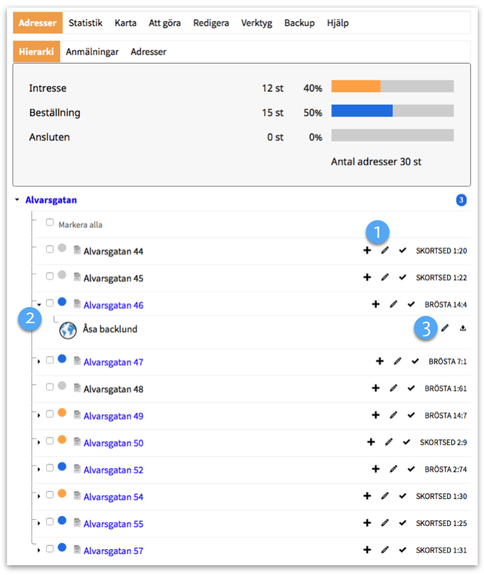 1. Klicka på plusset till höger om en adress för att manuellt skapa en Anmälan som kommit in på annat sätt än via webben. Klicka på Pennan för att redigera Adressen