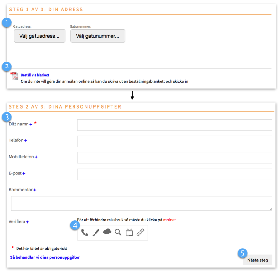 1. Om kund sökt på sin adress är den förvald, annars väljer kund gatunamn och ev. siffra/bokstav i menyn