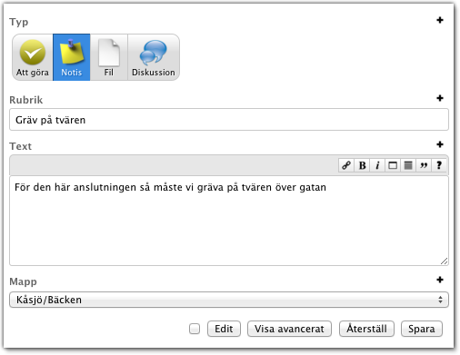 Här kan ni skriva vilken rubrik eller text eller typ som ni vill, det fungerar som projektrummet alltid fungerat. När ni sparar så kommer ni tillbaka till området