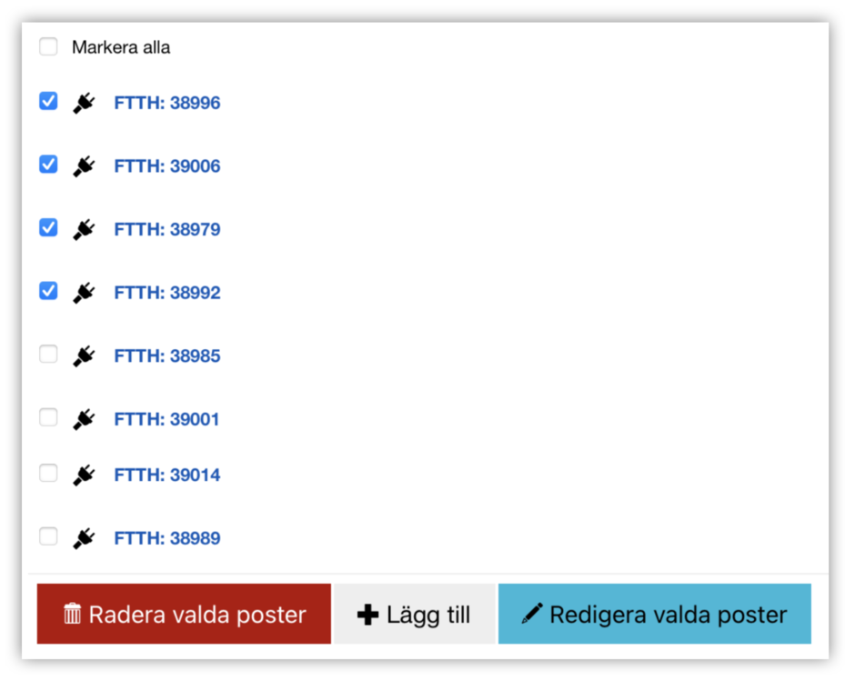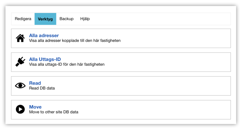 För att batchredigera urval/sökresultat - t.ex. alla uttag på en specifik adress/fastighetsbeteckning - klicka på / sök efter en adress eller fastighet > klicka på aktuell adress/fastighet > klicka sen på fliken Verktyg > Alla adresser eller Alla uttagsID. Nu kan du markera de adresser/uttagsID:n som ska redigeras och sen scrolla ner och klicka på Redigera valda poster och välj sedan fält enligt ovan.