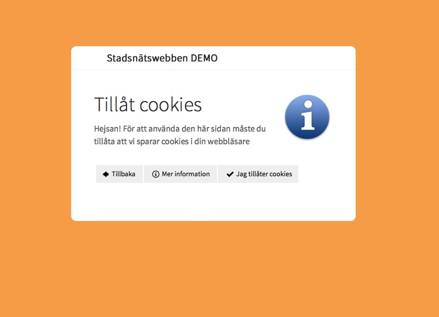 Med den här inställnigen vald så kommer det på de sidor där vi sätter cookies komma upp en liten informationsruta om att sidan använder cookies. Där finns en "Mer information"-länk som går till en sida med en standardtext om cookies som ni kan redigera (eller länkar till det ni valt som cookie-länk), samt en "Jag förstår"-knapp som gömmer den här rutan.