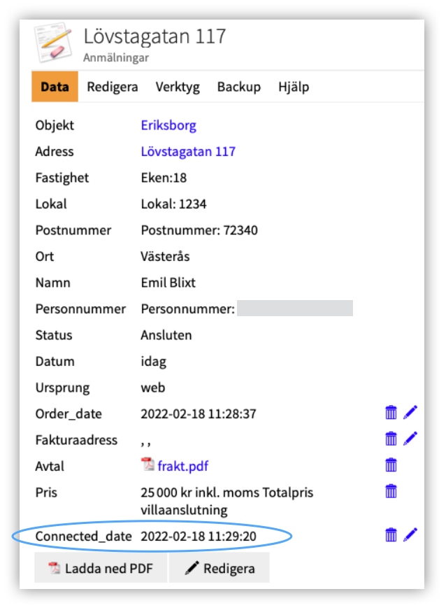 Nu sparas datum för statusändringar i Anslutamotorns anmälningar, tidigare har vi endast visat det datum då en första Intresseanmälan eller Beställning gjorts, nu visas även datum för ändrad status, t.ex. när en adress markerats som Ansluten.