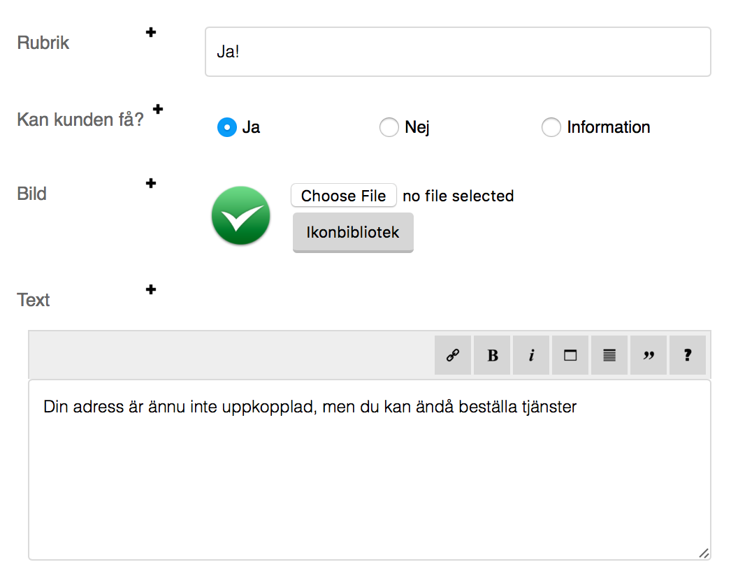 Använd AdminTjänsteguidenMeddelanden för att redigera meddelanden för "Internet: Ingen kapacitetsinformation i databasen", "Telefoni: Ingen CPE-information i databasen", "TV: Ingen TV-information i databasen" samt "Datum för anslutning är i framtiden" för att avgöra hurivida någon av dem tillåter eller inte tillåter beställning i Tjänsteguiden.