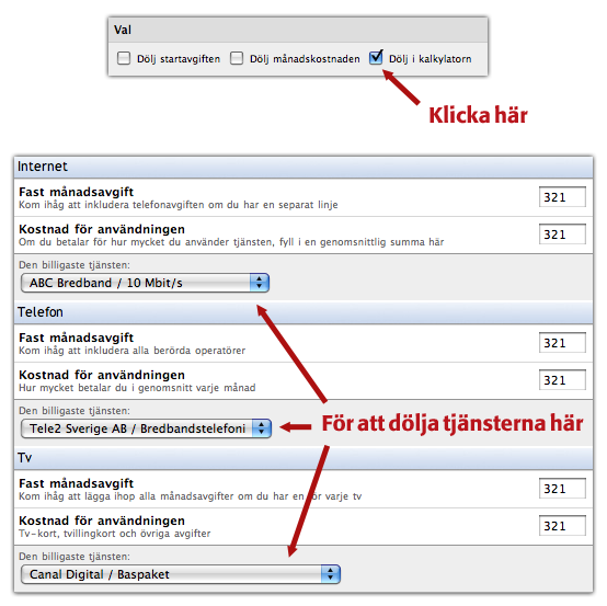 Numera kan man dölja tjänster från kalkylatorn genom att klicka i "Dölj i kalkylatorn" när du redigerar tjänsten. Det innebär att tjänsten inte syns i kalkylatorn som ett val för Internet, TV eller Telefoni. Detta är bra om du till exempel har påbyggnadspaket för TV men som kräver en bastjänst, vilket blir missvisande.