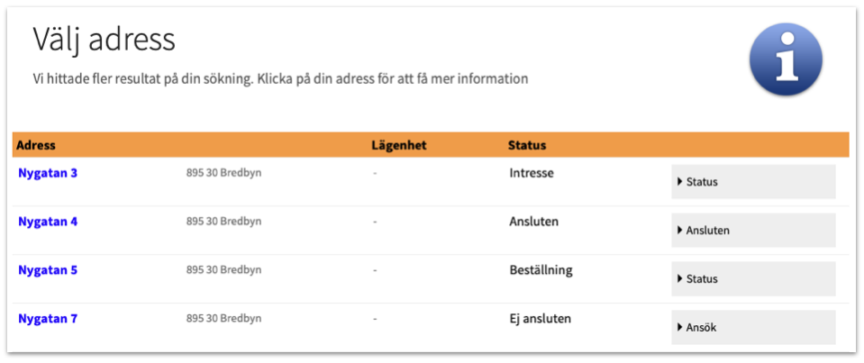 När kund söker på en ofullständig adress i Anslutamotorn (ex: "Nygatan" ist för "Nygatan 5") visas en lista med adressförslag där kund får klicka på sin adress. (Om ni inte kryssat för "Adressök visar endast exakt träff", då måste kund söka på fullständig adress för att få träff) I denna lista visas även status för respektive adress
