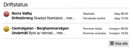 Aktuell Driftstatus visar pågående och kommande driftstörningar. Finns inga visas automatiskt texten: Ingen aktuell driftinformation just nu. Genom att klicka på knappen Visa alla visas en listvy med alla tidigare registrerade driftstatusmeddelanden.