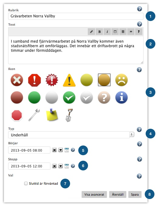 Det kan finnas tillfällen då man vill skapa andra typer av meddelanden än störningar. Därför kan du ange andra typer, t ex Information, och välja andra ikoner vid dessa tillfällen.