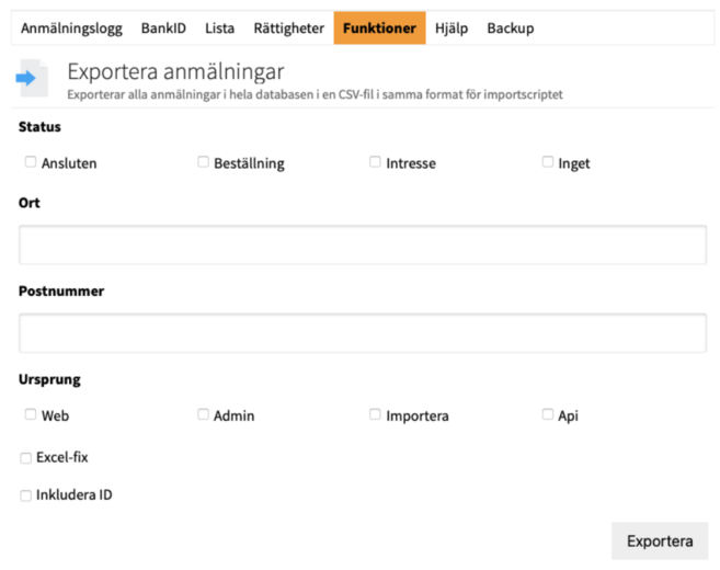 I Anslutamotorns anmälningsexport finns nu möjlighet att filtrera bl.a. på status och ursprung om man t.ex. endast vill få ut anmälningar med status Beställning, anmälningar skapade av admin eller anmälningar för en specifik ort eller postnummer.