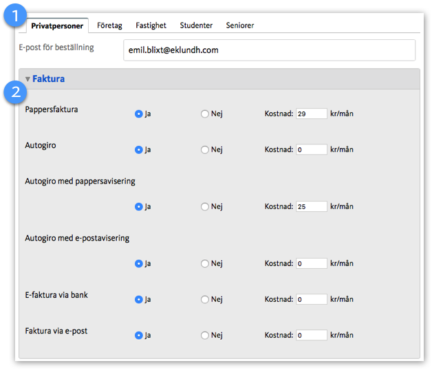 Här anger du vilken fakturering som ska vara valbart för kund vid beställning i Tjänsteguiden.