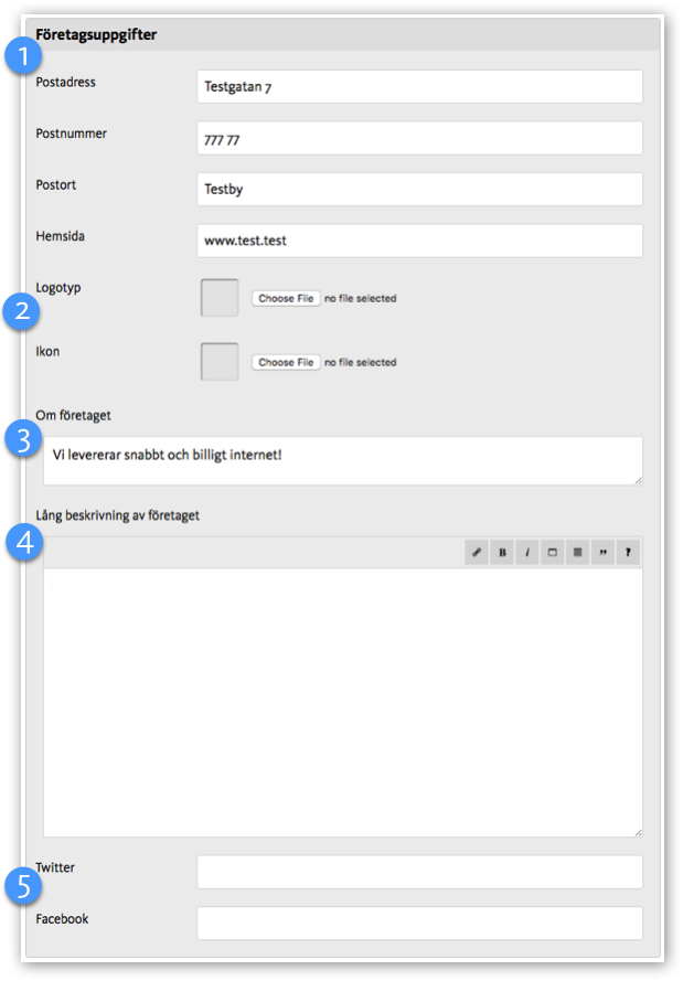 Här fyller du i adressuppgifter, beskrivning och länkar till sociala medier