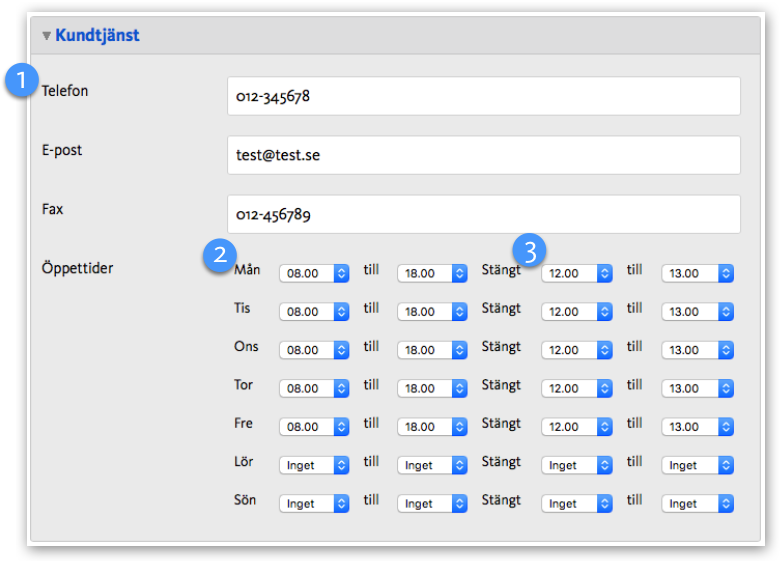 Här anger du kontaktuppgifter och öppettider