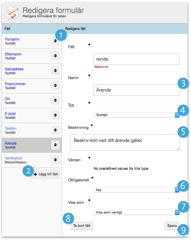 - Fält. Här ser du alla dina skapade fält. Klicka på ett fält för att redigera det under redigera fält i högerspalten. Klicka på svarta pilarna för att dra fälten i den ordning du vill ha dem.