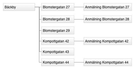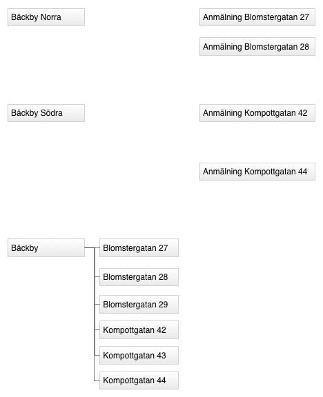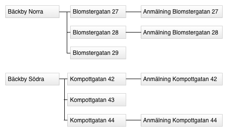 Så här kan till exempel två objekt se ut. Vardera har tre adresser och två anmälningar. Dessa anmälningar sitter ihop med adresserna via