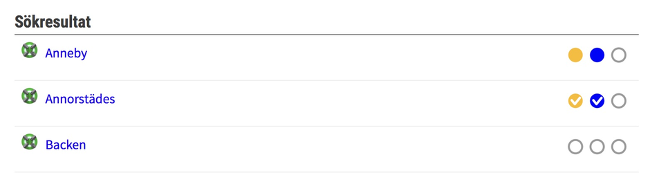 I översikten visa statusen per objekt eller adress. Antalet ringar till höger motsvarar antalet nyckelsteg. Tom ring betyder att det inte påbörjats, färgfylld ring visar att steget påbörjats och bocken att det är klart.