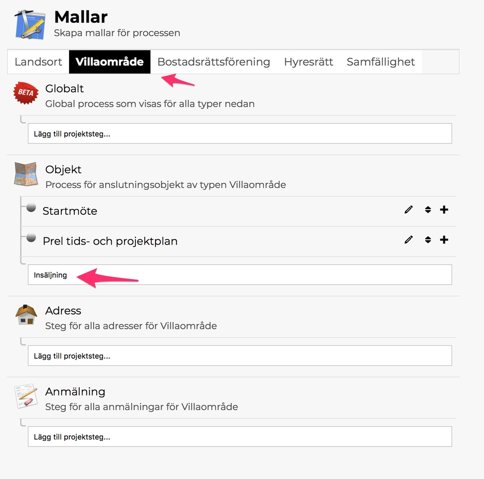Varje processteg kan innehålla ett antal underaktiviteter. Klicka på + (plusikonen) till höger för att skapa understeg. Dessa kan då aktiveras per område eller inte. Nya understeg kan även skapas lokalt på objekt, adress eller anmälan.