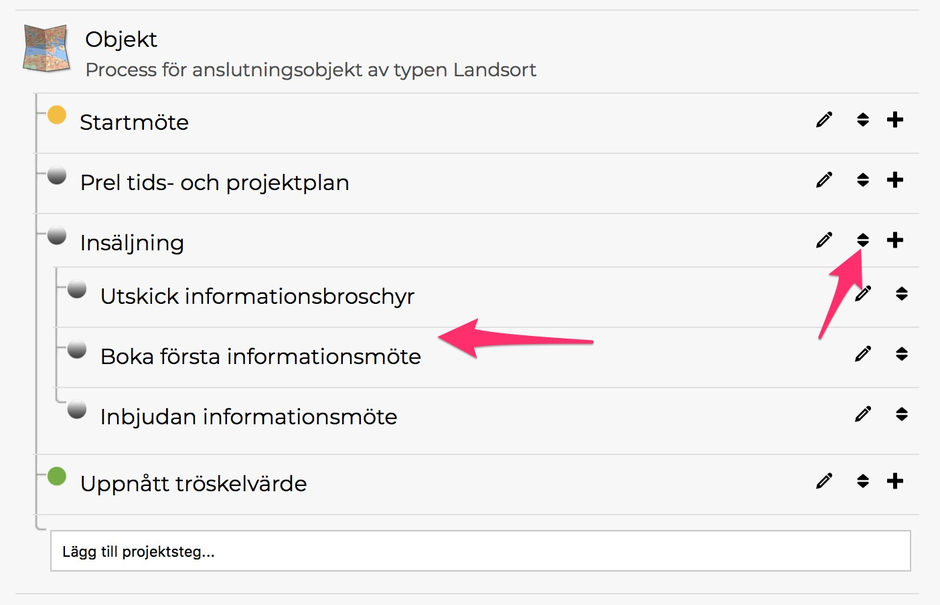 Klicka på + för att skapa understeg. Ta tag i pilarna för att ändra ordning på stegen.