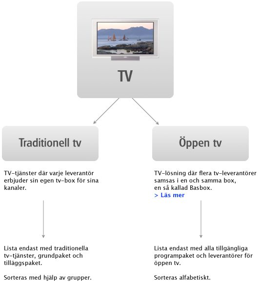 I Tjänsteregistreringen anger du om tjänsten är i kategorin ”TV” eller ”Öppen TV”. Har du båda kategorierna kommer kunden att få ett val när han klickar på TV-knappen i Tjänteguiden (se illustration).
