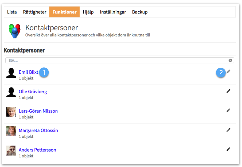 Det går även att redigera kontaktpersoner direkt på områdessidan. Klicka på pennan i adminlisten för redigeringsläge och sen på Redigera kontaktpersoner i grå verktygsfältet Info