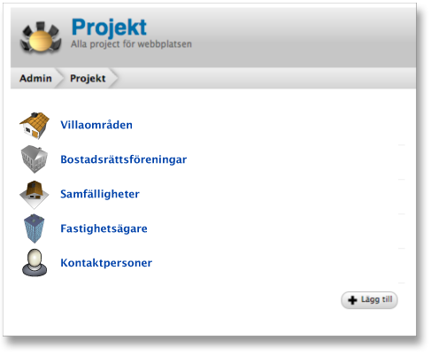 Om ni tänker använda möjligheten att aktivt arbeta med anslutaprocessen via webben, det vill säga kunna skapa och administrera Att Göra-aktiviteter per objekt, så behöver varje kundkategori ett projektrum. I projektrummet får du överblick och kontroll över alla aktiviteter inom Villaområden eller Bostadsrättsföreningar m m. Läs mer om detta under menyn Att Göra.