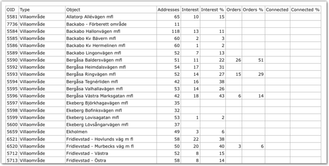 I filen ser ni alla objekt, deras OID, deras typ samt kolumner för antal adresser, och sedan intresseanmälningar, beställningar och uppkopplade, samt en procentkolumn för varje status.