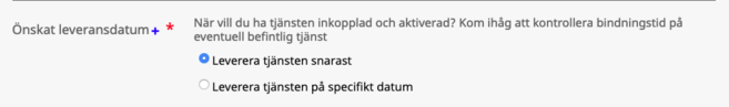 Väljer man "Så snart som möjligt" så får slutkund två val, antingen så väljer dom "Så snart som möjligt" eller så kryssar dom i att tjänsten ska levereras vid ett specifikt datum, där dom som tidigast kan välja en vecka framåt. Detta eftersom slutkund ska kunna välja ett datum flera veckor eller månader framåt då dom kanske flyttar in eller deras nuvarande tjänst upphör osv.
