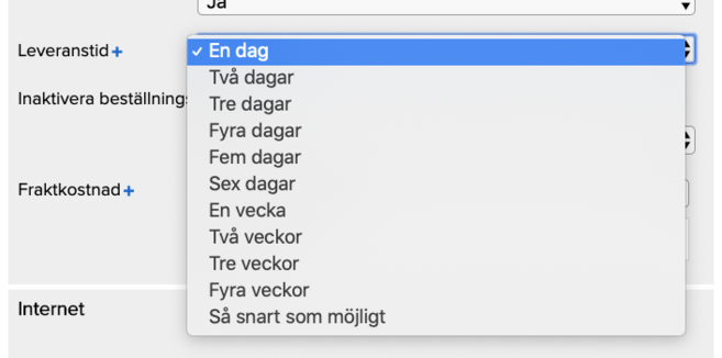 Väljer man leveranstid på "2 veckor" så kommer slutkunden kunna välja ett leveransdatum från två veckor och sedan framåt och det förvalda är om två veckor.