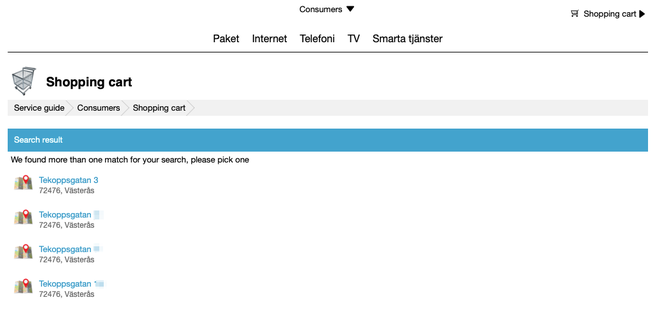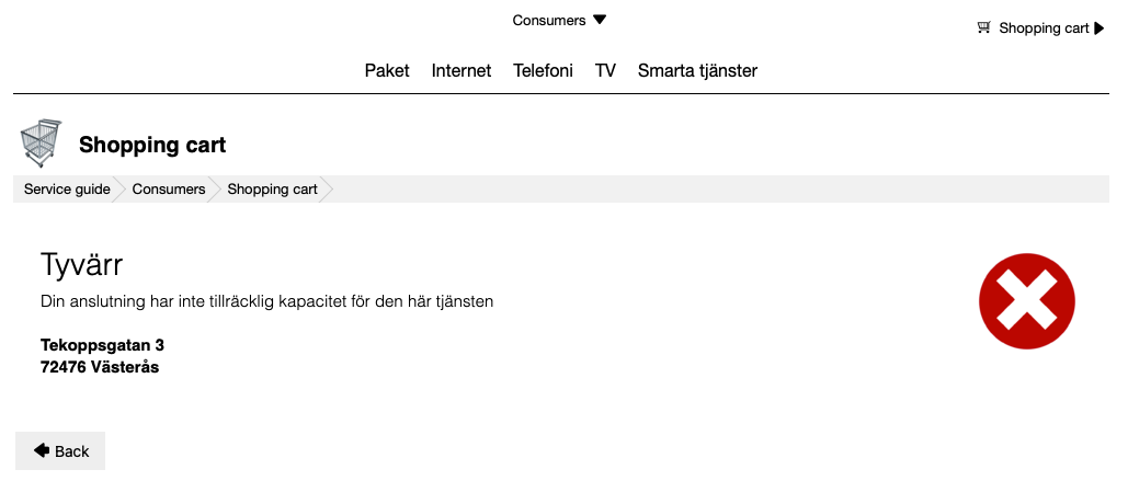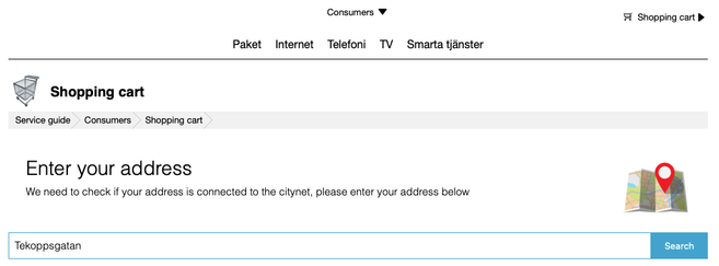 En planerad förändring för Tjänsteguiden är hur "lägg i varukorg"-knappen fungerar. Idag så kommer det upp en liten dialog där kunden får skriva in sin adress (om ni har funktionen 'endast verifierade adresser för beställa' i Tjänsteguidens inställningar) och eventuellt felmeddelande visas om kundens utrustning inte kan leverera tjänsten.