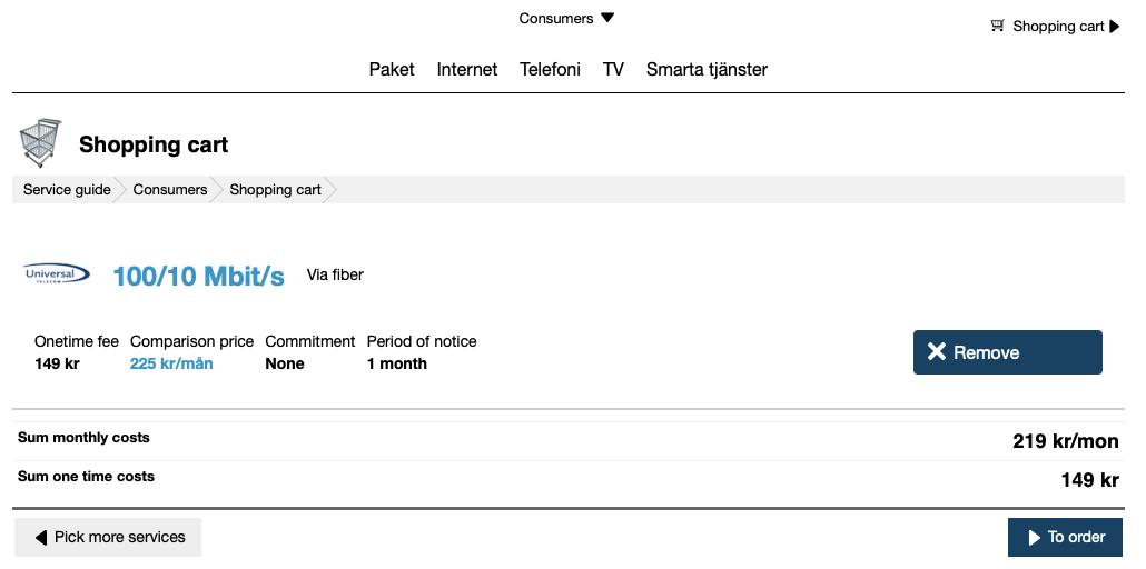 Om inte så ser jag min kundvagn, redo att checka ut, men med en knapp för att gå tillbaka och välja fler tjänster