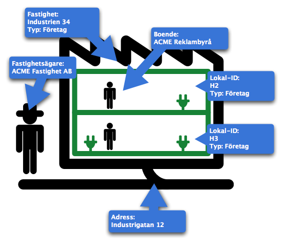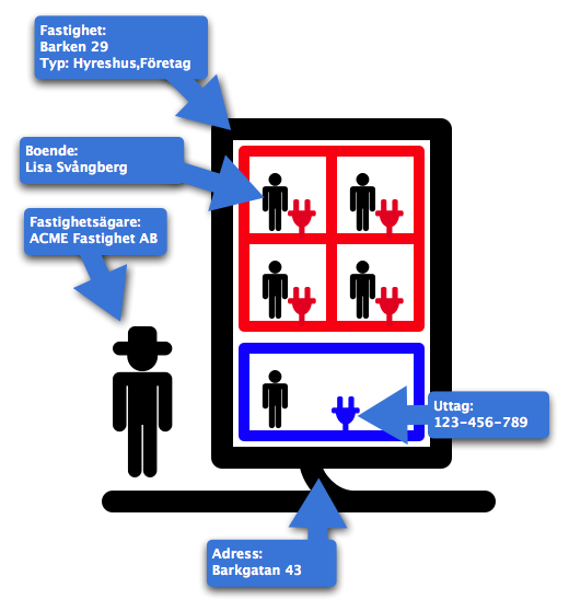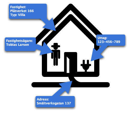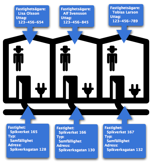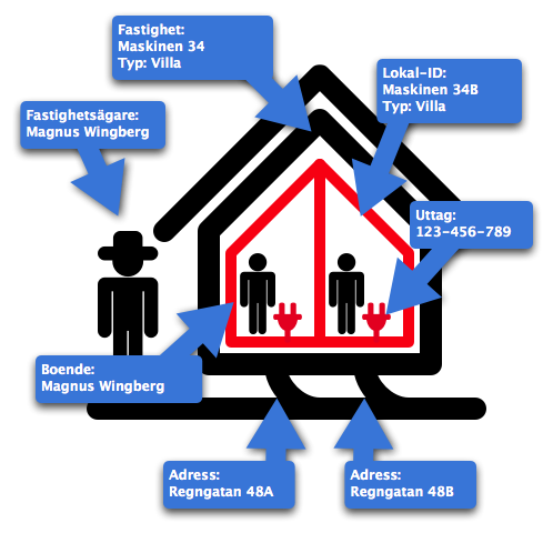 Villan är rätt så enkel. En villa har i regel inga lokaler så uttaget är alltså kopplat direkt till fastigheten. Samtidigt så är kontaktuppgifterna för fastighetsägaren, vilket också är boende, men bör bara anges en gång.