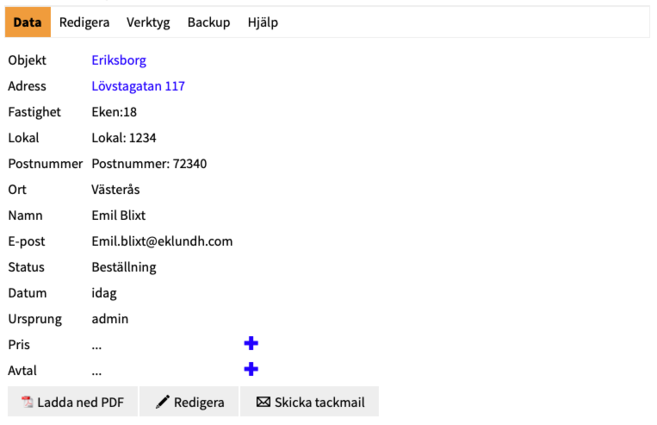 Klicka på Skicka tackmail för att skicka bekräftelsemail (kräver att anmälan innehåller mottagar-epost) och på plussen för att lägga till pris och ladda upp fil med avtal. Detta går endast att göra på anmälan manuellt skapad av admin eller via import