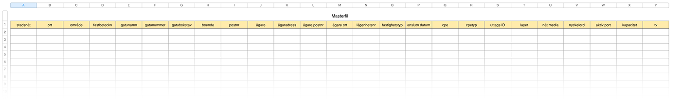 För att göra master-importen, det vill säga importen för hela databasen, med alla data samlat på samma ställe, så måste man följa en specifikation, samt se till att datat är korrekt formatterat. Vår rekommendation är att ni har en masterfil med all korrekt data sparat hos er och tömmer databasen vid varje import för att säkerställa att datat i marknadsdatabasen alltid är detsamma som er masterfil.