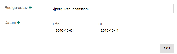 Här kan du söka på de anmälningar som senast redigerats (eller lagts upp) av en given administratör