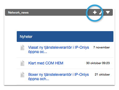 För att skapa nyheter från masterwebben som skjuts ut till de lokala webbarna finns det ett par alternativ. För att skapa en nyhet så kan ni klicka på plus-knappen i nyhetsmodulen, så förväljs rätt kategori ("Nyheter")