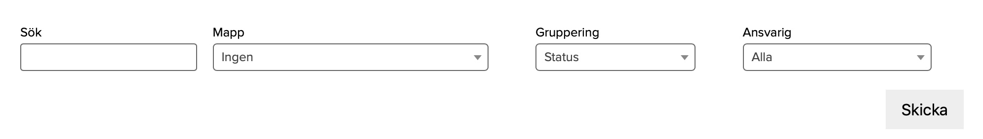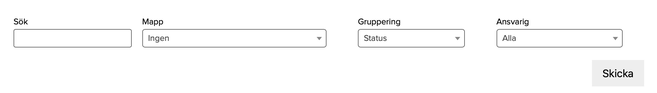 Du kan selektera urvalet i vissa visningsvyer genom att välja Mapp, Status eller Ansvarig. Gör dina val och klicka på Sök för att ladda resultatet.