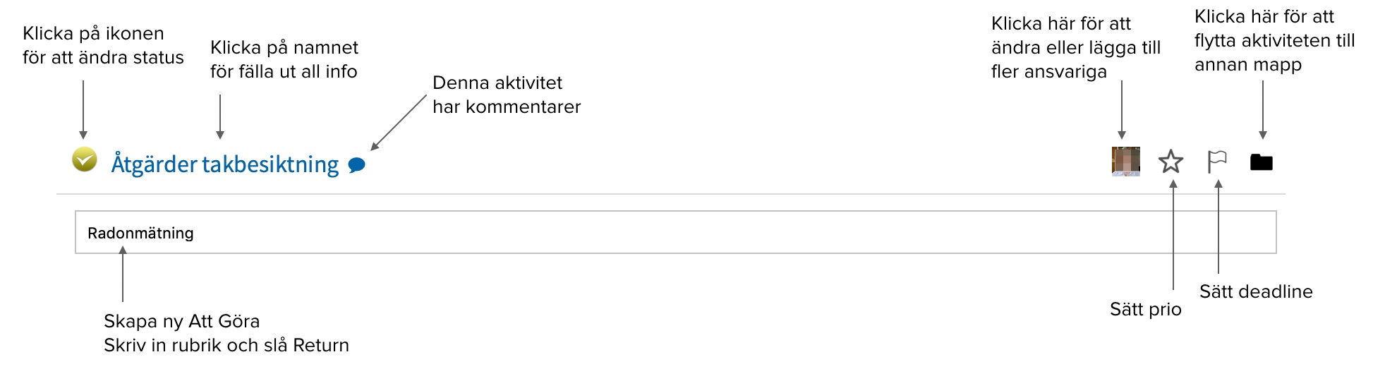 I Projektrummet kan du skapa aktiviteter "Att Göra". Du kan tilldela dem till någon ansvarig, sätta prio och deadline och koppla de till en viss mapp i din mappstruktur. Menyn Uppgifter visar alla uppgifter i projektrummet i en processtatusvy som Inkorg, Att Göra, Aktiv, Leveransklar eller Färdig. Se videon om hur du arbetar med uppgifter/aktiviteter.
