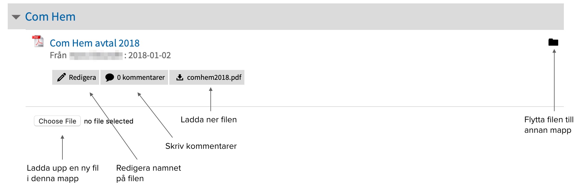 Här visas den mappstruktur med huvud- och undermappar du skapat. Under varje mappnamn visas hur många uppgifter, filer och diskussioner det finns i mappen. Klicka på någon av dem för att se innehållet. Se videon om hur du skapar en mappstruktur.