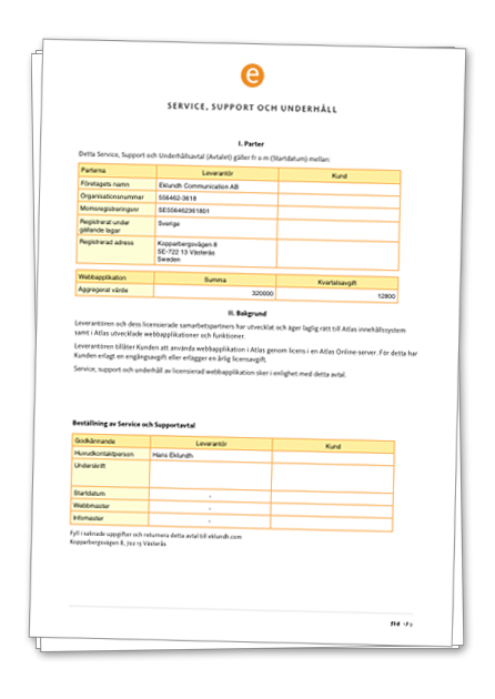 I månadsskiftet maj-juni skickar vi ut ett nytt Service- och Supportavtal till alla våra Atlas-kunder. Avtalet ger prioriterad support med tydliga roller, förfaringssätt, SLA och servicenivåer. Läs igenom avtalen och underteckna och returnera formuläret om du vill ha prioriterad support. Avtalet omfattar bland annat: