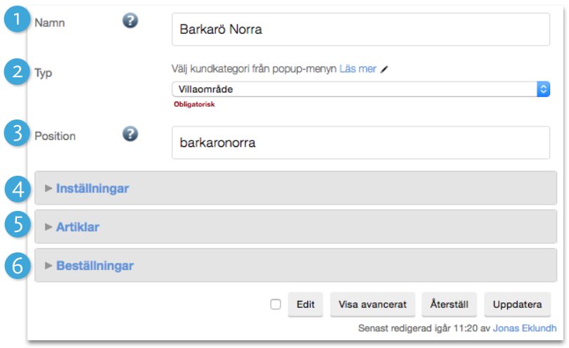 1. Namn. Här anger ni områdets namn, gärna med lokal anknytning så besökare lättare hittar sitt område.
