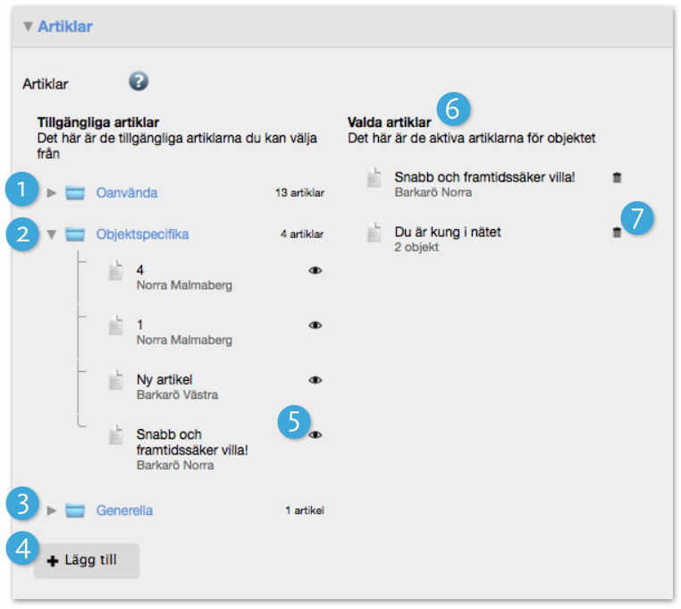 6. Valda artiklar. Här ser ni de artiklar som finns på områdessidan. Dra artikel från någon av mapparna och släpp här för att lägga till på sidan. Dra sedan artiklarna i den ordning ni vill att de ska visas.