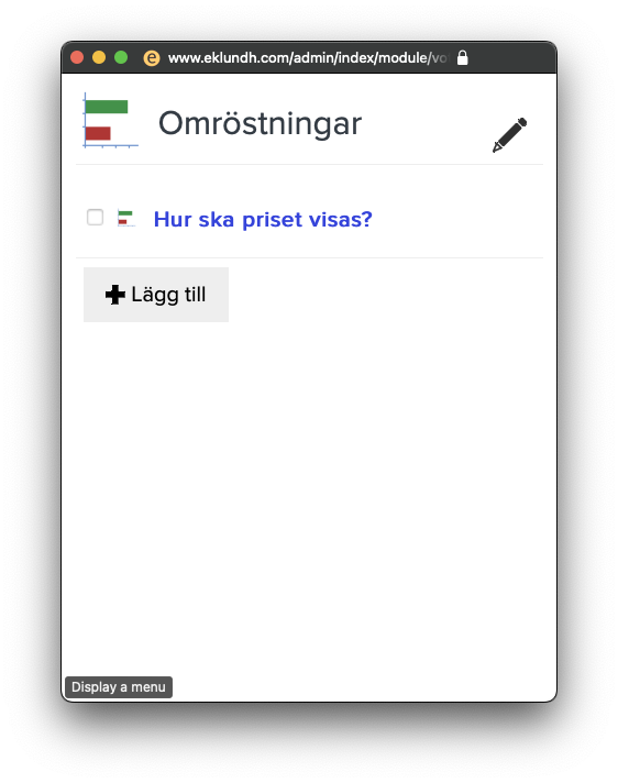 I admin-läget så klickar du på "Bifogat..." och sedan på Omröstningar. Då får du upp en lista över de omröstningar som ligger inne och kan skapa nya. Knyt dem till ett stycke och sätt ett namn och beskrivning på frågan. Du kan också bestämma att enbart inloggade medlemmar kan rösta.