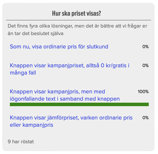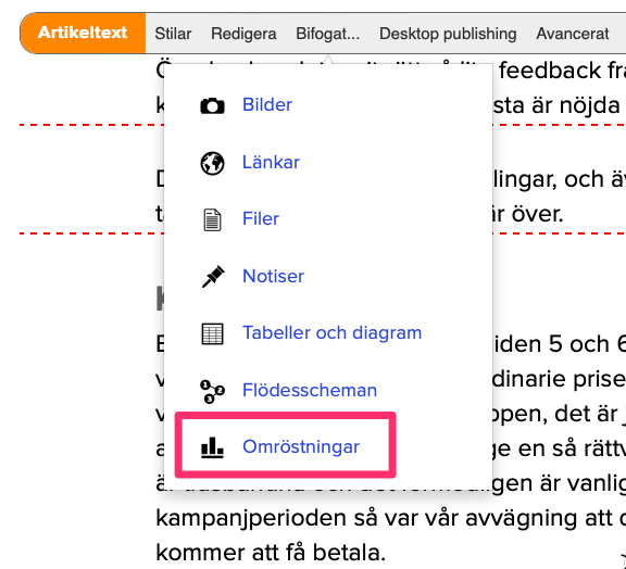 Du kan skapa omröstningar till en artikel, antingen direkt i artikeltexten eller visat bredvid artikeln i en egen modul (som eventuellt inte är aktiverad på er sida, säg till i supportloggen i så fall).