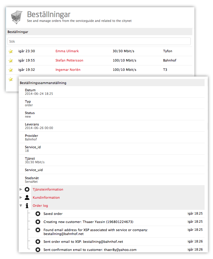 Alla genomförda beställningar loggas och du kan se dem i Tjänsteguiden Admin > Beställningar. Beställningsloggen visar varje genomförd beställning med all orderdata samt utskickade mail.