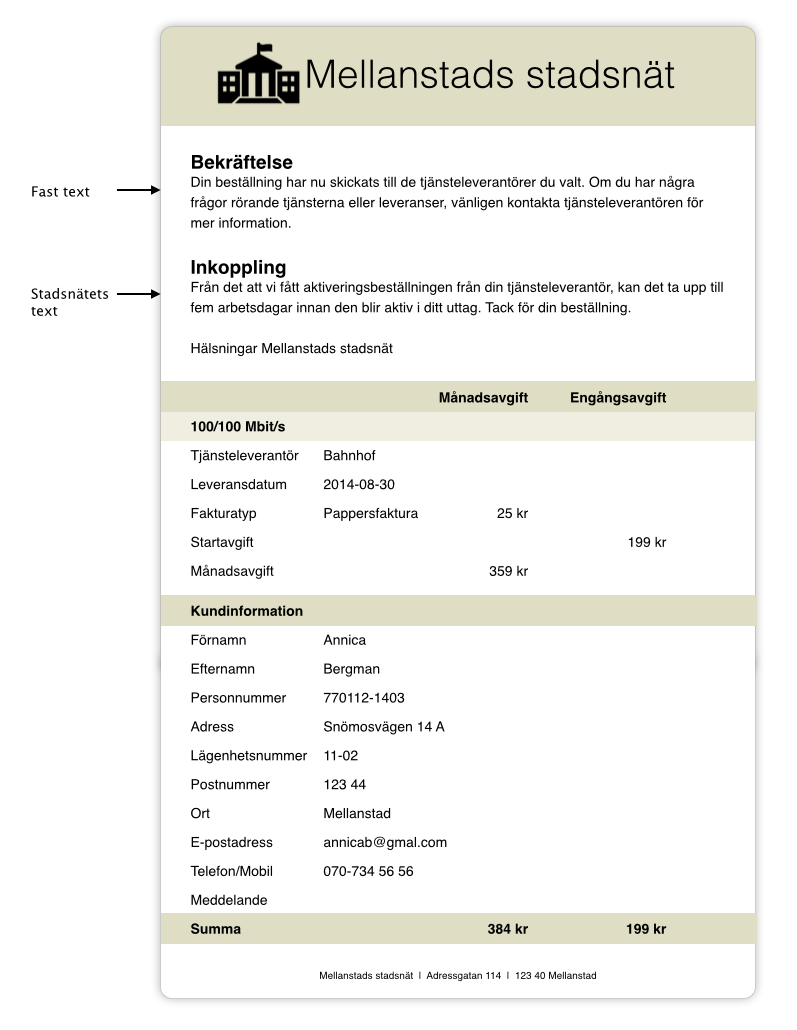 Om stadsnätet vill ha en kopia på beställningen så fyll i aktuella epostadresser i Tjänsteguiden > Inställningar. Där kan också stadsnätet lägga till en hälsningstext till kunden som adderas i beställningsbekräftelsen (se Inställningar).