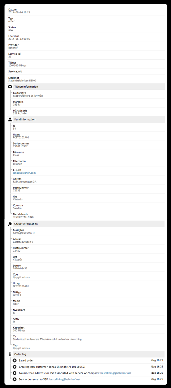 Förutom den beställningsinformation som kunden skriver in så läggar vi också till befintlig information om porten från Marknadsdatabasen till tjänsteleverantörerna.