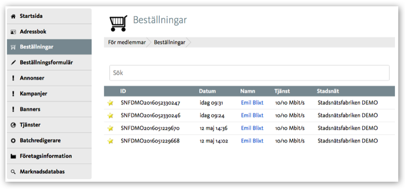 I Tjänstekanonen (Stadsnätsportalen > För medlemmar > Beställningar) kan du se dina registrerade beställningar med alla data under knappen Beställningar. Klicka på kundnamn för att se all info om aktuell beställning.