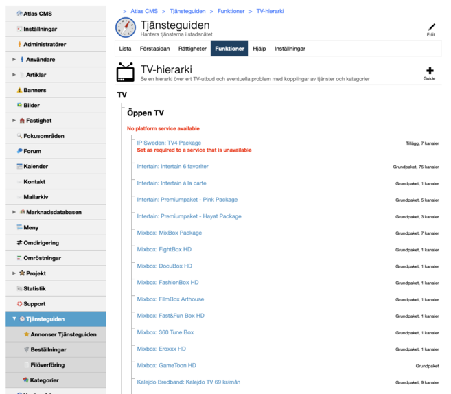 Det finns nu en ny funktion under Atlas CMSTjänsteguidenFunktioner som heter "TV-hierarki" där ni kan se ert TV-utbud och se vilka tjänster som är länkade till vilka andra tjänster, kategorier eller plattformar. Framförallt så visas felmeddelanden när kopplingar saknas eller blir fel så ni kan föra en dialog med tjänsteleverantörerna om vad som kan behöva rättas till. Dom har en liknande vy på Stadsnätsportalen