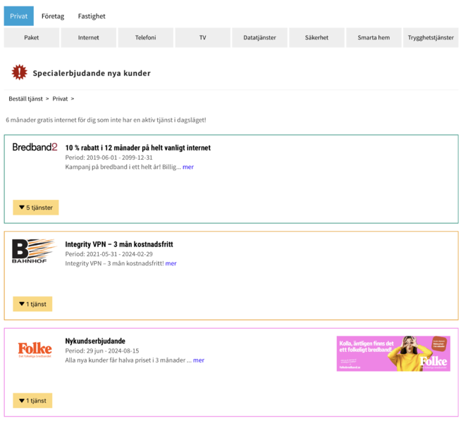 På förstasidan på er Tjänsteguide så kan ni skapa rutor för erbjudanden, som då slumpas fram och populeras av kampanjer från leverantörerna, men finns det en (eller fler) sådana här paketkampanjer så kommer de alltid först, så en idé kan ju vara att göra första erbjudande-rutan större när det är aktivt. I den rutan visas rubrik, kort text och eventuell bakgrundsbild (annars den färg ni valt för rutan i inställningarna för förstasidan).