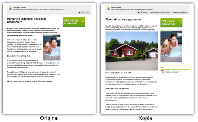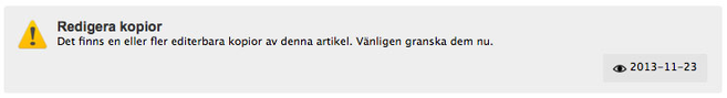 När du befinner dig på den publika originalartikeln visas (endast för inloggade admins) en information om att det finns en eller fler kopior samt en länkar till dem.